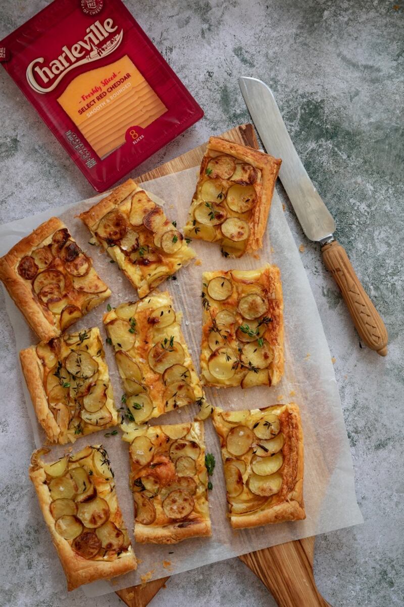 Wash potatoes and slice them as thinly as you can. Put them into another bowl with the remaining oil and toss well with the sea salt. Put the cream cheese and cream into a bowl with about half of the thyme leaves, and mix well together. Take the pastry out of the fridge and spread the cheese mixture evenly all over, then top with sliced Charleville Cheddar inside the crust lines. Scatter the onion slices on top, then arrange the potato slices in neat rows, so that they slightly overlap. Mix the egg yolk and milk together, and brush it over the crust.