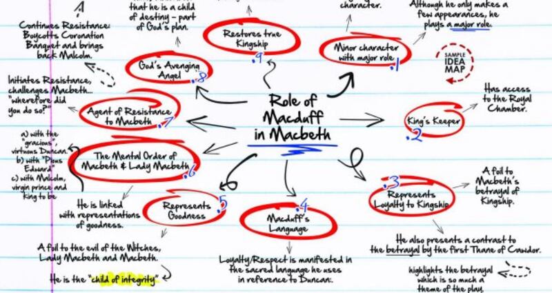 1. Begin at the centre of an A4 page in landscape orientation; write down your central concept on the page and circle it, box it in, or mark it in some way. In this case we have underlined in blue the heading “Role of Macduff in Macbeth”.