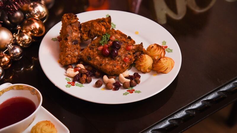 This is a beautiful and festive meat-free dish to serve on Christmas Day. It is made with hazelnuts, cashews and cranberries with cheddar cheese and seasoned with rosemary, thyme and black pepper.