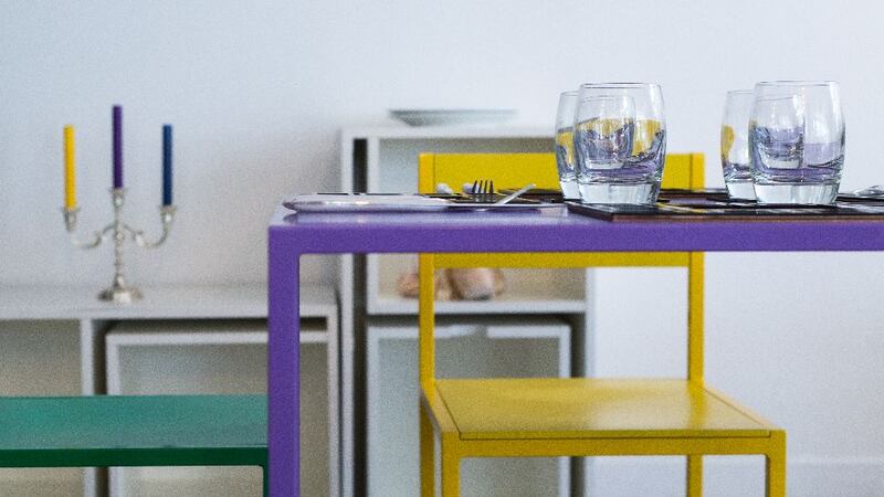 From this, the Out of Nowhere range was born - a product range that she describes as dual-function transformer furniture. “There is a lot of multi-function furniture out there, but multi-function tends to mean that it operates one function at a time. My furniture can operate different functions at the same time and that suits how we all live,” she says, as she pulls four colourful dining chairs and a table from the skeleton of her bookcase. It’s a remarkable sight and one that has been entertaining people since she created it.
