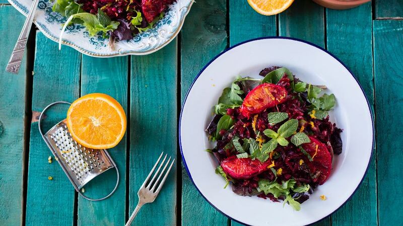 - Then add in the sliced spring onion, chopped mint, Udo's Oil, vinegar, orange zest and the peeled and segmented orange plus any juice, mix well.
