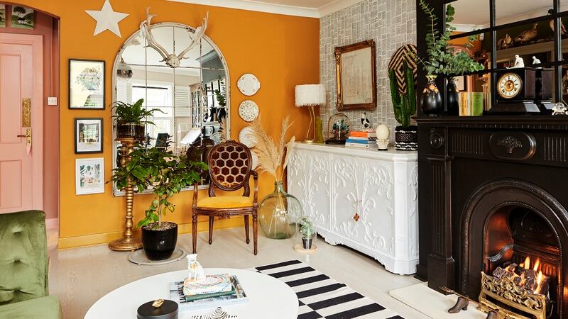 Recently she painted another sitting room wall a deep mustard – so it, “now looks like a pumpkin latte”. A large mirror and ornate black fireplace complete the décor here.
