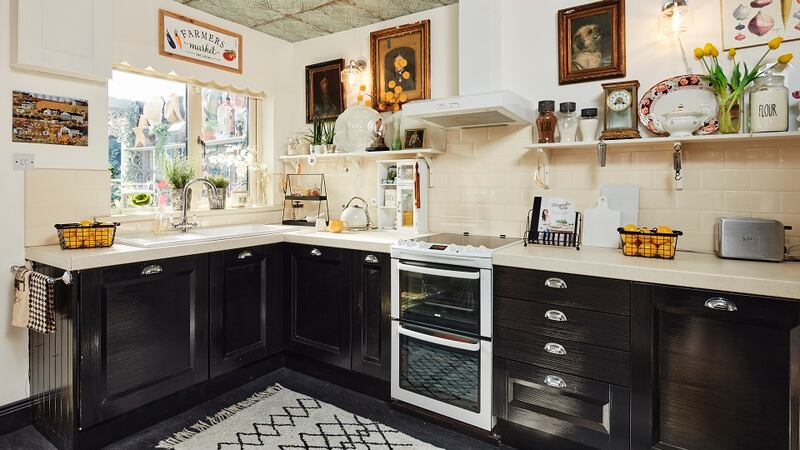 “In lockdown, I also painted the kitchen cabinets black and papered the ceiling with a tin-effect wallpaper to give it that honky-tonk vibe. Everything is on a budget, and is usually done by me,” she says.