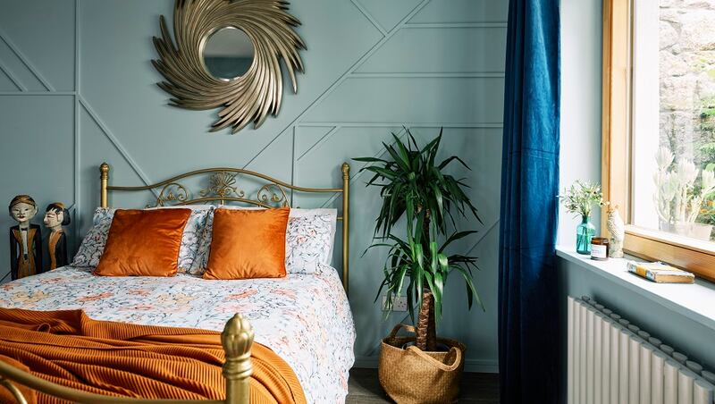 A recent example is a bed frame bought for €30, which she painted and the finished piece has helped transform the master bedroom. So too has some abstract panelling, designed along with Ben, but, “he did all the hard work, woodwork is not my forte,” she laughs.