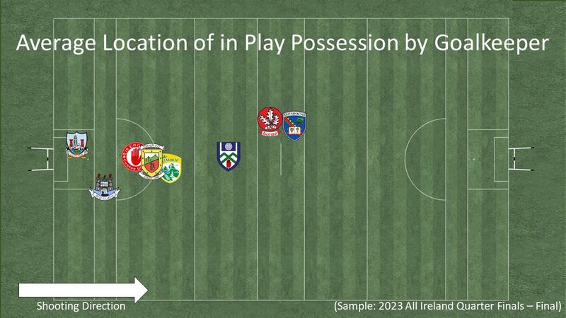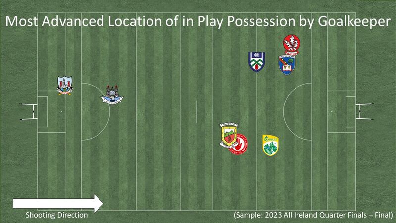 A look at goalkeepers’ outfield possessions in the latter stages of the 2023 championship highlighted that Odhrán Lynch and Ethan Rafferty are the two who were attacking furthest up the field. Lynch has become a crucial attacking threat for Derry as he attacks channels just outside the D, getting shots off himself and also creating gaps for others to exploit. He has certainly added to his kick-outs as well – his length to midfield contests was a factor in two of Derry’s goals against Dublin in Croke Park.