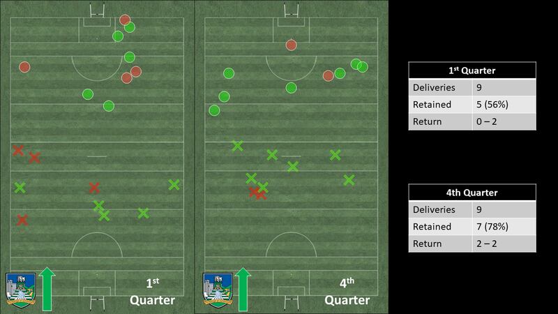 However, Limerick’s delivery game did function in the opening quarter where they got off nine deliveries, winning five and yielding a return of 0-2 – it could have been more but their shooting was wayward. It was however in the final quarter where Limerick did some real damage, as they mined 2-2 off deliveries, as they worked the ball further up the field and supported the deliveries with runners. Furthermore, Adam English brought energy to the middle sector and Cian Lynch started to influence the game in the middle third, while Hegarty’s placement inside created a new dynamic.