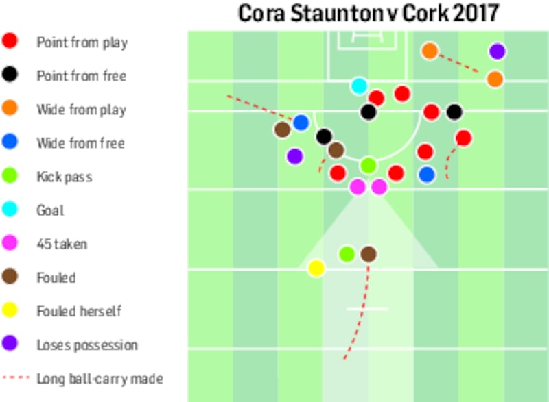 So in those two games, a scoring chance was generated 65 per cent of the time when she had the ball in play. When the ball gets to Cora, however much you limit that from happening, a scoring opportunity tends to arrive. So Dublin need to limit that supply, and force it into isolated areas.