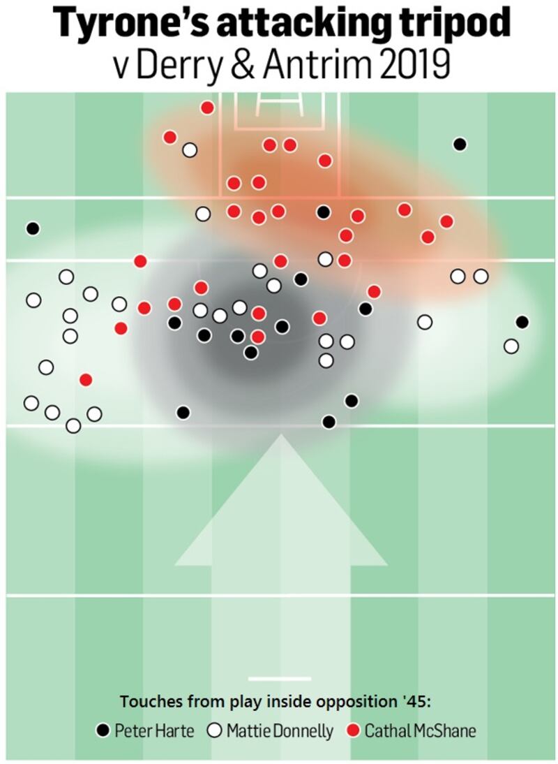 So what changed? Tyrone decided to deploy midfielder Cathal McShane at full-forward and stick with it, with Mattie Donnelly floating around him. When team captain, Donnelly, decides to go out the field he's replaced inside by Peter Harte. Who otherwise looks to exploit the pockets of space from halfway to the edge of the D, created by Tyrone's inside double threat. And most importantly, they are kicking the ball into them.
