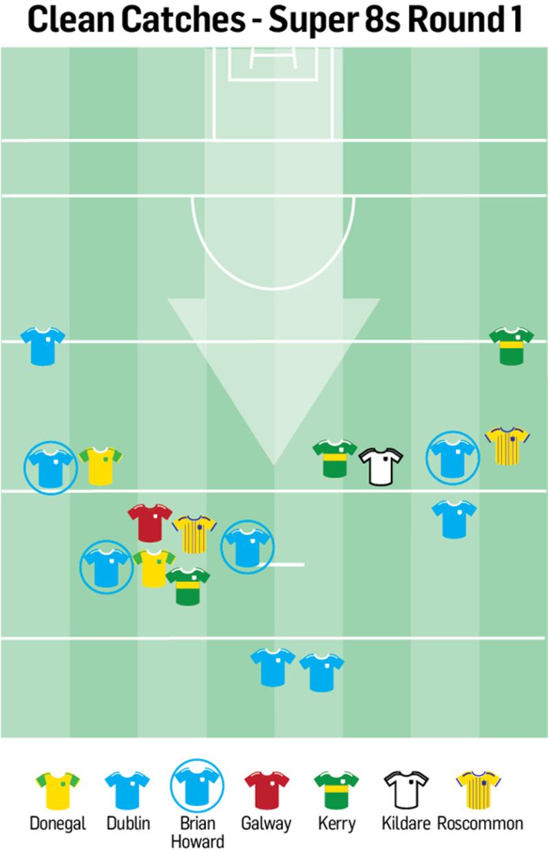 Howard replaced his clubmate, Fenton in last year’s Leinster final. Twelve months later and between them the Raheny duo accounted for seven of the 17 balls that were caught overhead and cleanly from kick-outs in the Super 8s maiden weekend. Howard alone made up just under a quarter of them, showing that the art of high fielding is alive and well (and clearly being practised) in Dublin’s squad.