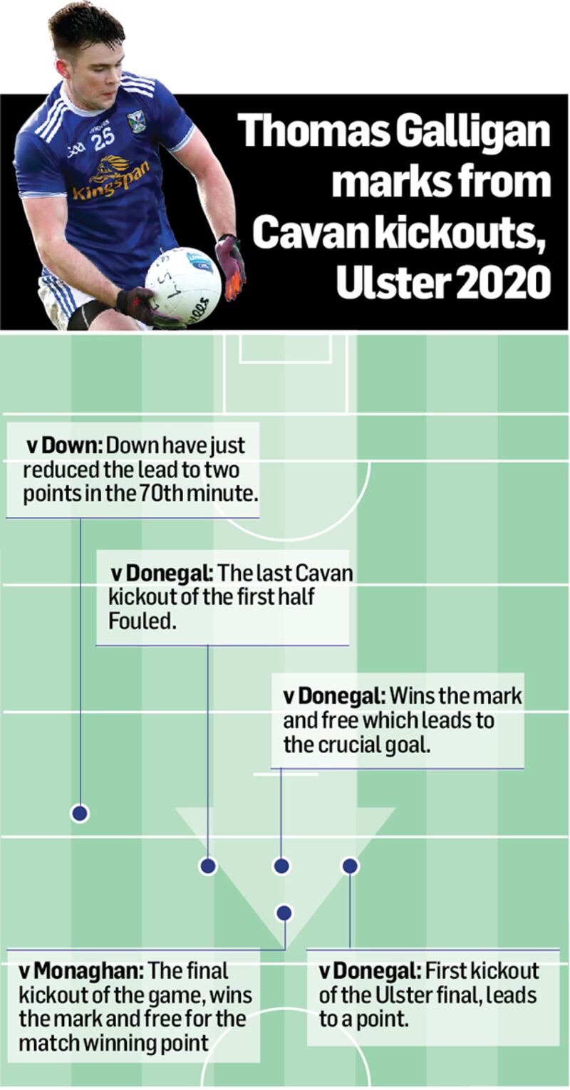 Last weekend he won three – the first Cavan kickout of the match which led to a point. The last Cavan kickout of the first half amid a worrying spell of just one point in the 20 minutes leading to the interval. And then he claimed the mark and free which led to the decisive goal as Cavan claimed their first Ulster title in 23 years.