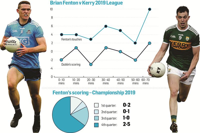 Against Galway a week earlier he’d had 19 involvements in the final 20 minutes as the Dubs outscored the visitors 1-6 to 0-1 in Croke Park. So Fenton’s strongest period is the final quarter, and that’s when Barry will have to be most aware of the threat he poses.