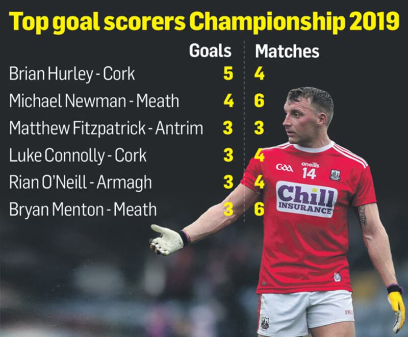 Hurley has scored more goals than any other footballer so far in the 2019 football championship. In four matches he has scored five and, including his last league game against Armagh when the Rebels first began to show their summer form, he has seven goals in his last five matches.