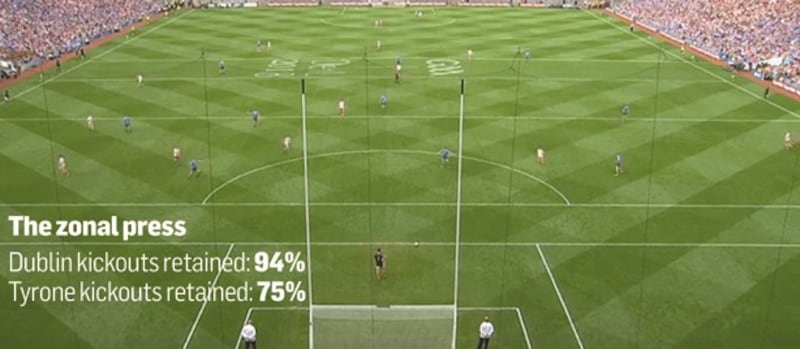 As usual, Stephen Cluxton was supreme and Dublin won all but two of their 31 restarts. Tyrone scores came off both. Tyrone won 75 per cent of their own kickouts, with Dublin's zonal press forcing the interception which resulted in a crucial penalty in the first half.