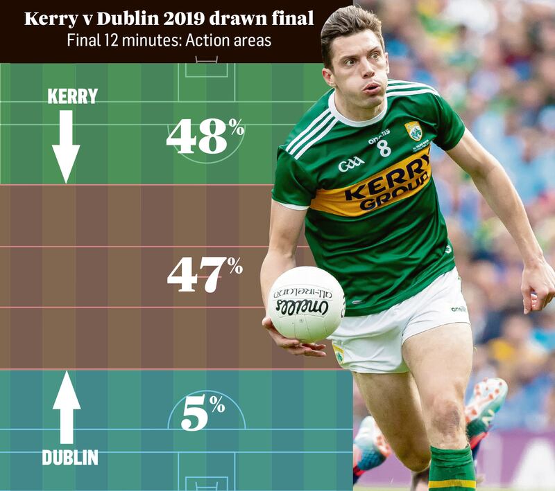 In comparison, 48 per cent of Kerry’s possession in that crucial closing period was inside their own 45. They held 82 per cent of it within their own half.