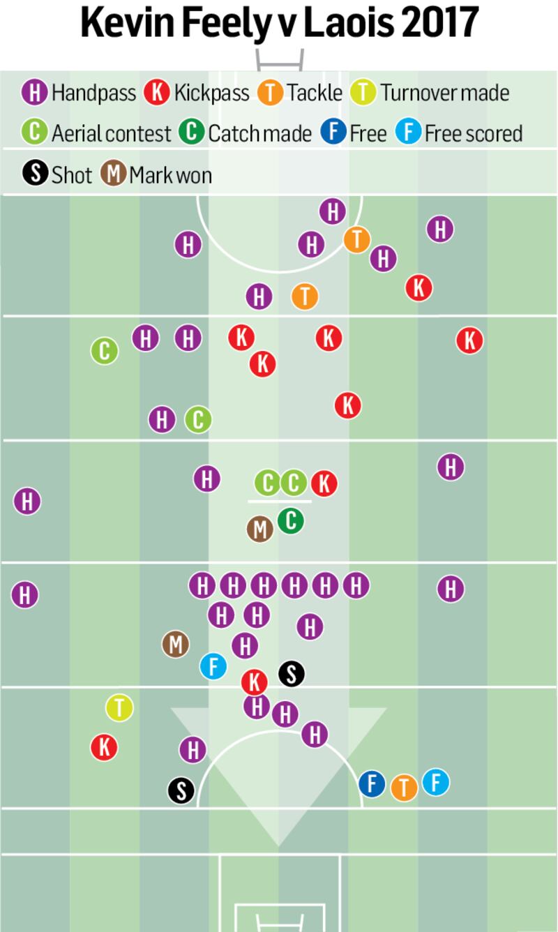 Against Laois, Feely had an incredible 55 involvements, and 45 of those were with ball in hand. He kicked frees with both feet, he had shots from play, he conducted from the 45 via foot and hand. He was a link man in the centre back zone. He was an option out wide, he attacked and he defended.