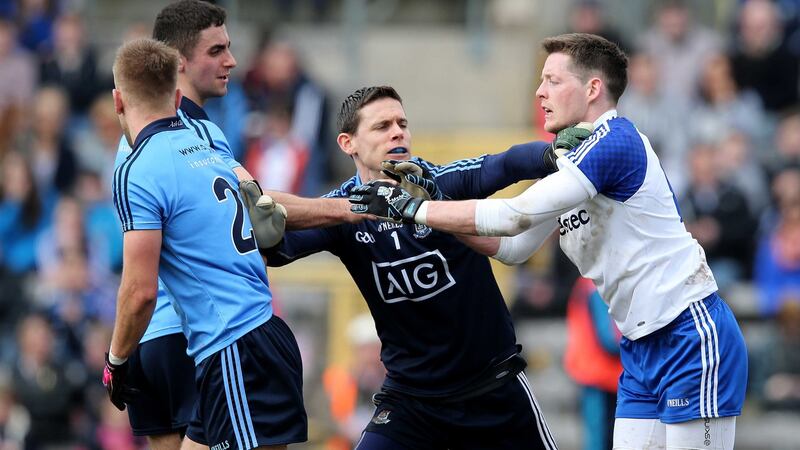 One way traffic in Clones as Dublin bedazzled their hosts. Two quick fire points from Kevin McManamon and Bernard Brogan and an astutely taken goal from Brian Fenton inside the opening five minutes meant the match was over almost as soon as it had started.