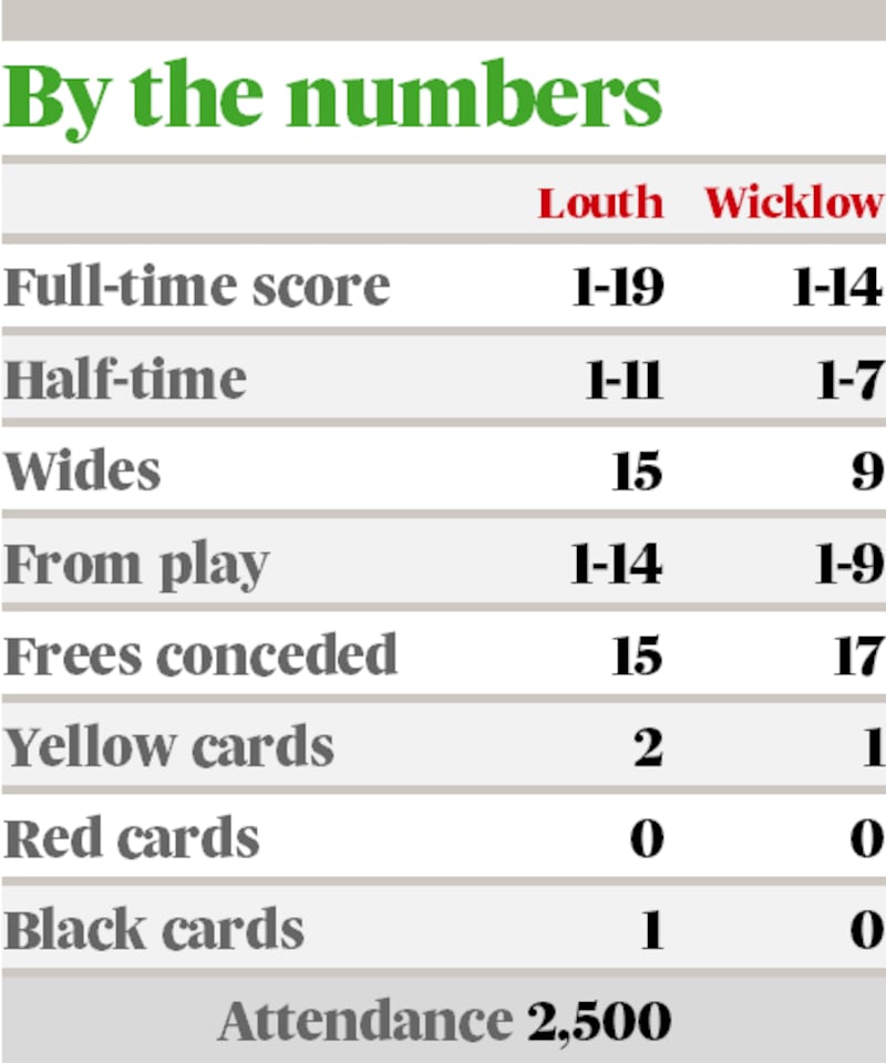 Louth led by four points at half time, 1-11 to 1-7, and started the better team. Their sweepers often left Ryan Burns isolated in attack, but they defended and attacked as one, each line of their team making runs to cause the Wicklow team problems.