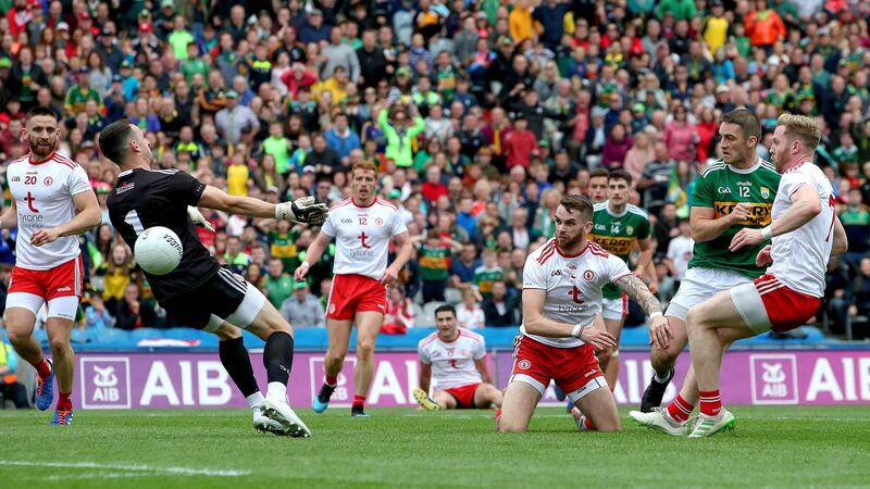 Everything that's good in the game was in here. Start with David Moran's 55-metre kick pass in behind Keith Higgins to put Paul Geaney away. Progress with Geaney's 20-metre fist pass across his body into James O'Donoghue's stride. Maybe grumble a little at O'Donoghue's shot - a touch high, a bit eager of itself maybe - but only a little. And finish with a goggle at the best shot-stopper in the game getting a fingertip to it, as David Clarke always seems to do, to divert it over and keep his net stilled.