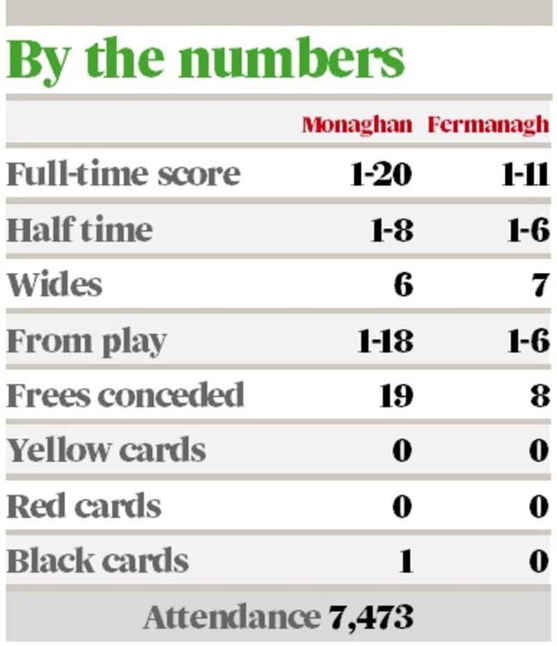 The bareness of the Fermanagh cupboard was such that they were only able to name one recognised defender among their 11 substitutes. By contrast, the level of relative plenty in the Monaghan ranks meant that they saw five points from play scored by subs, including an eye-catching cameo from Owen Duffy whose three points in 10 minutes on his introduction were exactly the gust the Monaghan sails had been waiting on.