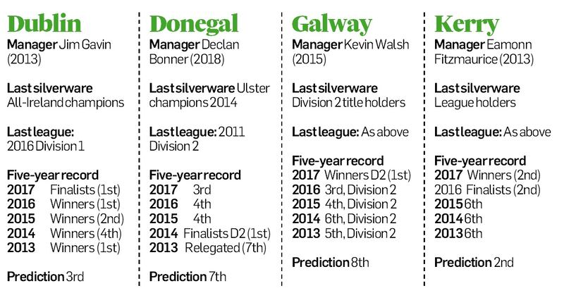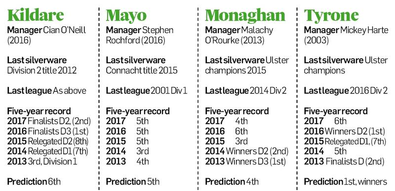 Pre-season odds suggest that Kildare and Galway are set for quick returns to Division 2 but that's a reflex reaction. In the 10 years of the hierarchical four-division league, the two promoted teams from the previous season have never been relegated straight back together. Now, in five of the operative nine years one of them has made a swift return. Galway have waited longest to return to the top but they have difficulties heading into the campaign. Corofin are still very much involved in the club championship and that together with injury is giving Kevin Walsh a less than ideal start to life back in the fast lane.