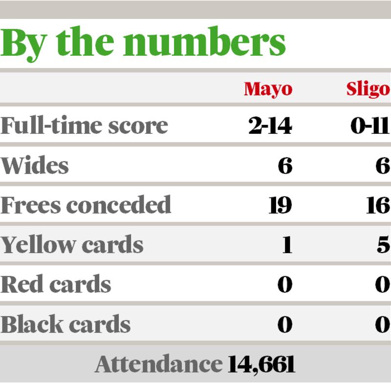 Sligo stayed organised and sticky and still trailed by that O'Connor goal with ten minutes remaining. The days when this Mayo team reach molten point in Connacht are probably over and they were competent here rather than outstanding. Fergal Boland enjoyed a creative debut performance and Ger Cafferkey return gives the Mayo defence an added depth.