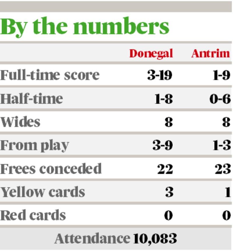 From being a close game, Donegal were 1-8 to 0-6 ahead going into the dressing room and in reality there was no way back for Antrim.