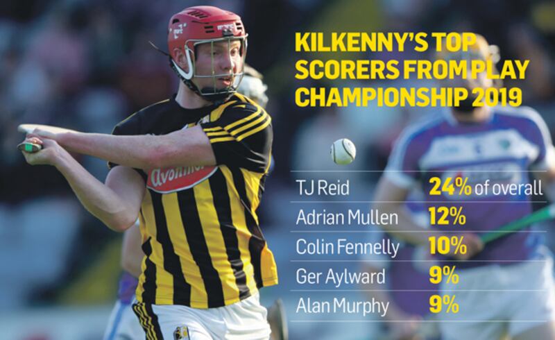 Reid alone has scored 52 per cent of Kilkenny’s goals and points in their four Leinster round-robin matches, with an incredible 5-42. And he has also scored 24 per cent of the team’s overall figure from play with 3-7. Carrying the burden, just a little then.