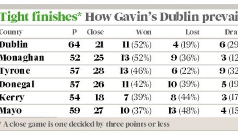 Under Gavin, Dublin have played 64 games in league and championship. Of the 21 that have been close – meaning the final scoreline has the teams separated by a goal or less – they’ve won 11, drawn six and lost four.