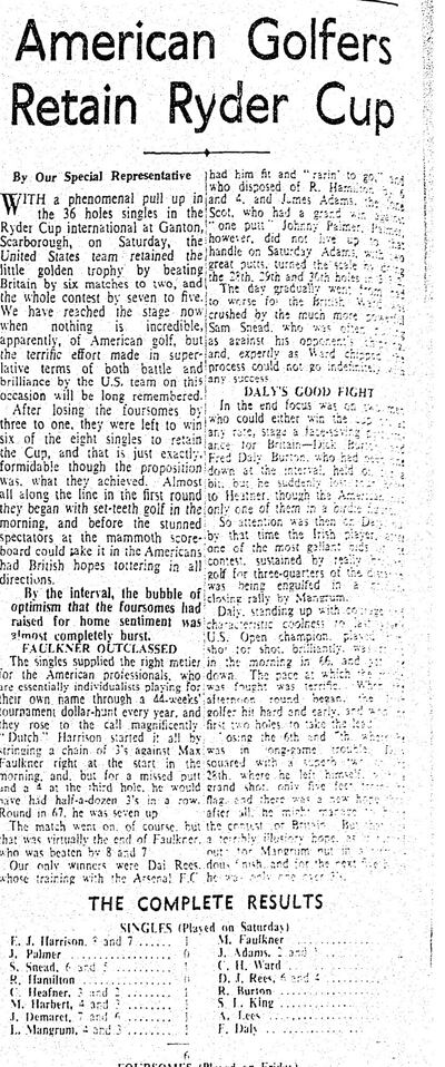 "The Americans are now thoroughly up against it; for they must now secure six of today's eight matches for victory," reported The Irish Times the following day. "In a day of terrific thrills and excitement, with 8,000 spectators thronging the fairways and stampeding for vantage points, Fred Daly, with his young partner Ken Bousfield, Dick Burton's brilliant assistant, contributed a win to the British roster."