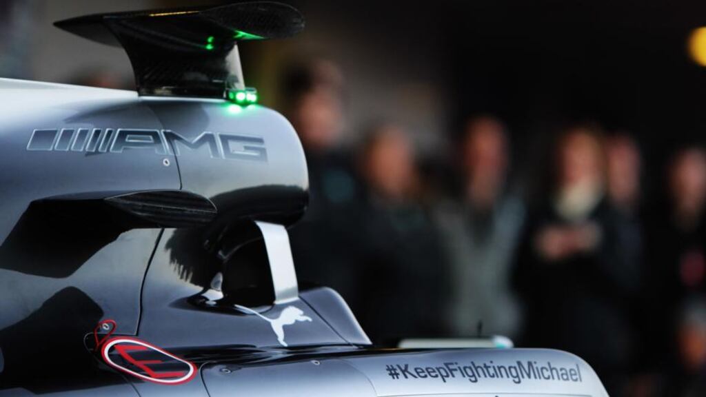 In this week’s first pre-season test in Jerez, the Mercedes car being driven by Nico Rosberg and Lewis Hamilton is carrying the message “#KeepFightingMichael”.