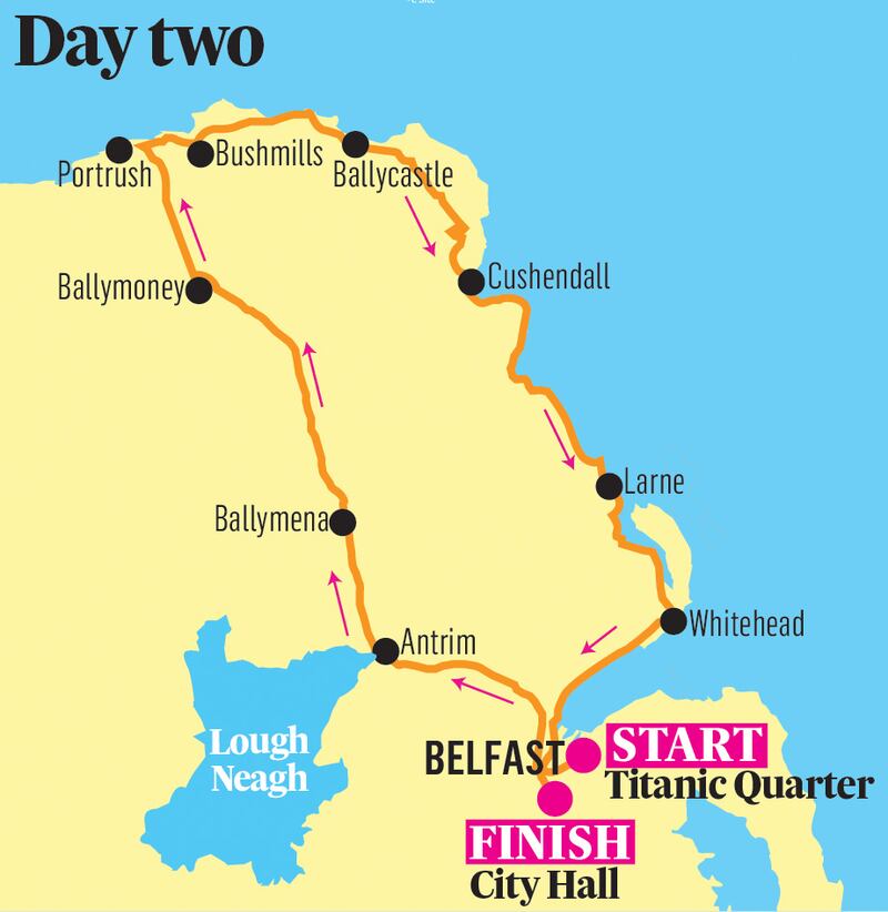 Stage two starts once again in front of Titanic Belfast. Riders will cycle to Bushmills, home of the Old Bushmills Distillery, which dates back to 1608. They will then head for the Giant’s Causeway and travel along the north Antrim coast before heading into Portrush, where spectating points include Ballybogey and Dunluce Castle. Another vantage point is just above Red Bay Castle, on a hill between Waterfoot and Cushendall; the riders will be visible along a length of coastline. As with stage one, today’s route concludes in front of Belfast City Hall.