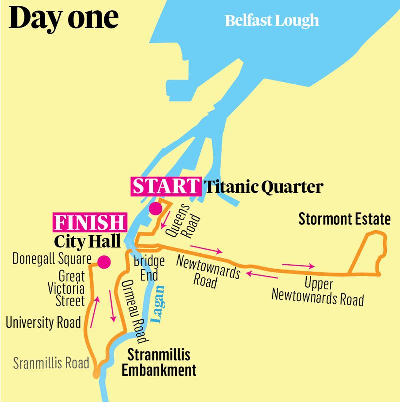 Starting at Titanic Belfast, riders will pass Stormont Estate, home of the Northern Ireland Assembly, before they travel up and then back down Newtownards Road, giving spectators increased opportunities to watch. Restaurants along the route plan to serve Italian dishes. The day’s race will finish in front of Belfast City Hall.