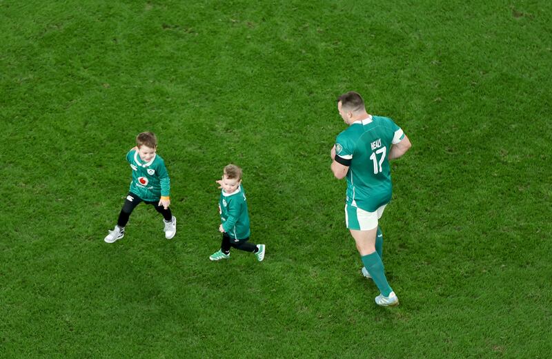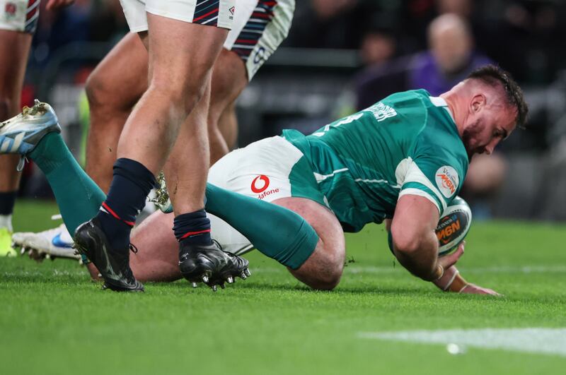 Ireland’s Dan Sheehan celebrates scoring Ireland’s fourth try in his first appearance for Ireland since his cruciate ligament injury. Photograph: Billy Stickland/Inpho