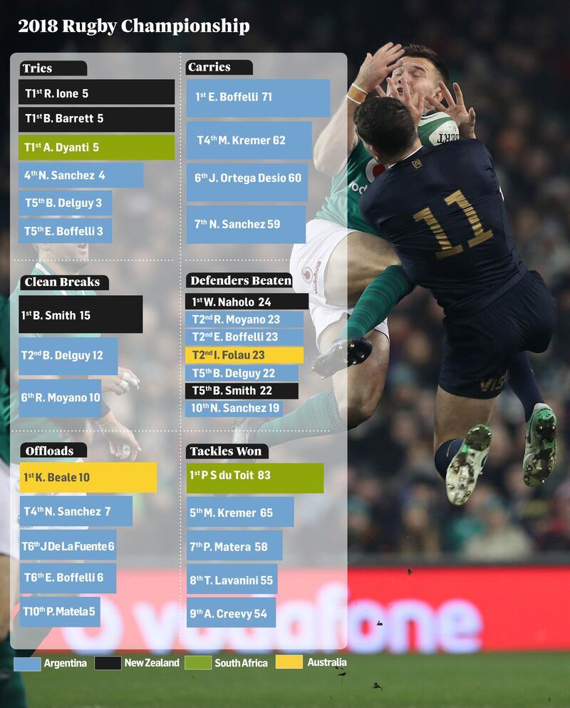 New Zealand wing Waisake Naholo led the way beating 24 defenders with Moyano and Boffelli on 23 alongside Australia's Israel Folau; Delguy was one further behind on 22, the same mark as New Zealand's Ben Smith. The Argentine back three beat 68 defenders between them in the Rugby Championship, an average of 10.8 per game.