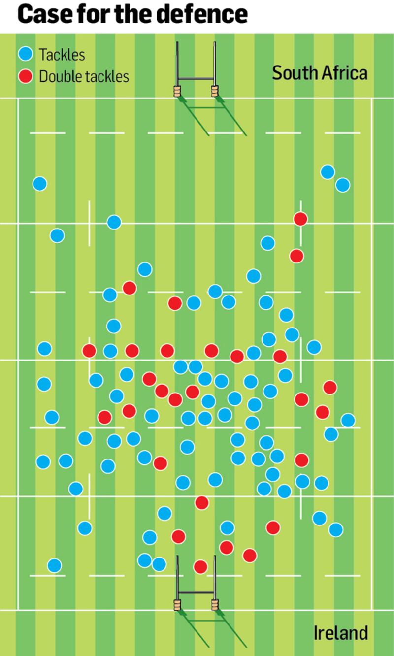 The dots in the graphic below are a representation – there wasn’t room to include all 110 tackles (31 with multiple tacklers) – of the nuances Ireland demonstrated in defence, the red dots indicating where Ireland committed multiple players to the tackle, usually two but occasionally three. On rare occasions it was born out of necessity when a Springbok won the initial collision, but in the main it centred on two Irish players, one going low and the other targeting the upper body/ball.