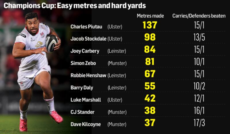 Zebo's average of eight metres per carry was only just behind that of Ulster fullback Charles Piutau (9) and while those of Stander (2.3 metres) and Kilcoyne (2.1 metres) pale when judged against the marketing leading numbers it's not a fair comparison when weighted against the physical environment in which the two Munster forwards carried for the most part.