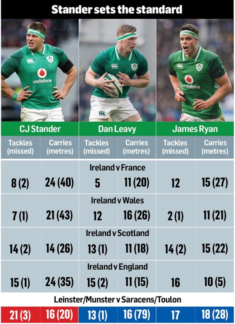 Stander's durability is equaled by his consistently high level of performance, regardless of how a game is going, but similar relentlessness is now evident from Leinster's dynamic duo James Ryan and Dan Leavy.