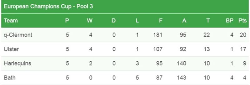 Ulster know that a win of any kind against Bath at the Kingspan will earn them a place in the quarter-finals as the best of the runners-up, at the very least. They would need a bonus-point win and Clermont to gain no more than a losing bonus point against Harlequins for them to top the pool, but even then a home quarter-final looks out of reach given their points differential.