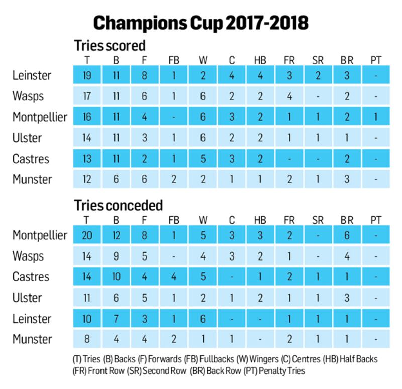 Did you know that Leinster were susceptible to conceding tries to wings in the first five rounds of this season’s Champions Cup, that 11 of the 14 tries Ulster have amassed to date in the tournament have been claimed by backs.