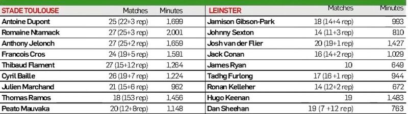 The contrast in games and minutes played this season is striking. If you look at the nine Toulouse players who played against Ireland and contributed to the French Grand Slam and compare them to their Leinster counterparts, all bar Ramos has played more than his opposite number.