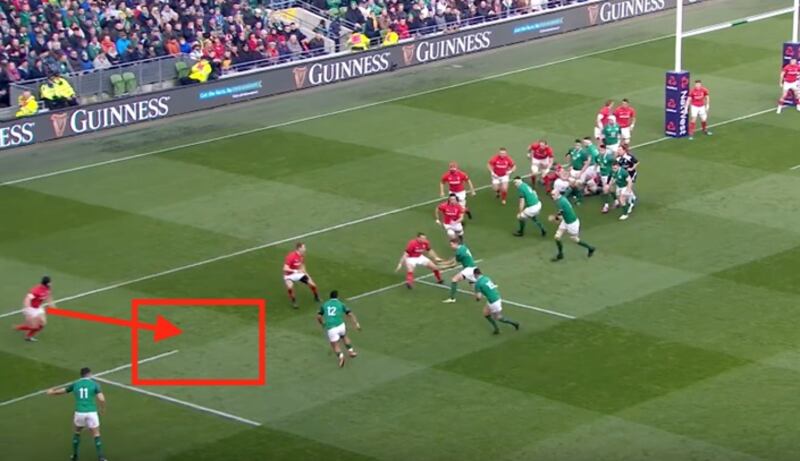 Wales are numbered up with Dan Biggar on Johnny, Liam Williams on Rob Kearney and Leigh Halfpenny covering Aki as Stockdale hugs the touchline.