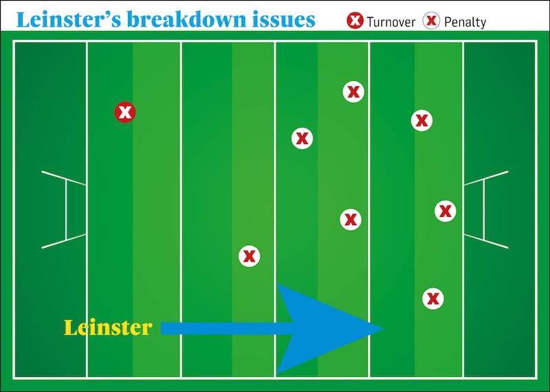 Taking an overview of the seven penalties that Leinster conceded at the breakdown, the graphic illustrates that six were in the Bath half and three were within 15m of the home side’s line.