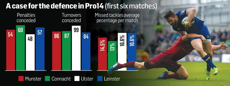 Six weeks of the newly revamped Pro14 offer a decent body of work to sift through and examine how the Irish provinces are faring in a number of categories, specifically the number of penalties conceded, the number of turnovers conceded and the average percentage of tackles missed.