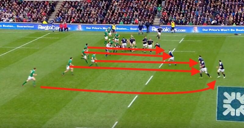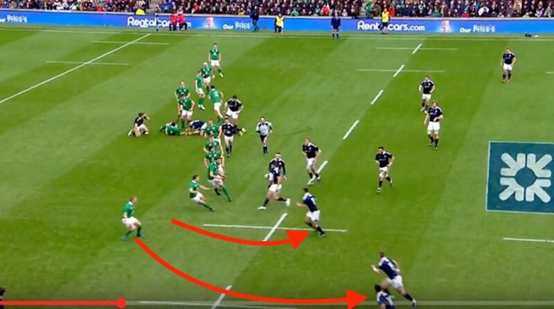 Four minutes before half-time in Murrayfield, Stander then Rob Kearney busted tackles to put Ireland on the front foot. Play was moving from right to left and after O’Brien carried next all Scottish eyes were trained on Conor Murray’s pass to Henshaw. This saw Ireland attacking with four against five Scottish defenders. If Murray got the call to come back right, Jackson could have used the three Irish forwards – Toner, Henderson and Heaslip – to fix three Scottish forwards with Kearney and Zebo waiting in space against one Scottish defender (Alex Dunbar).