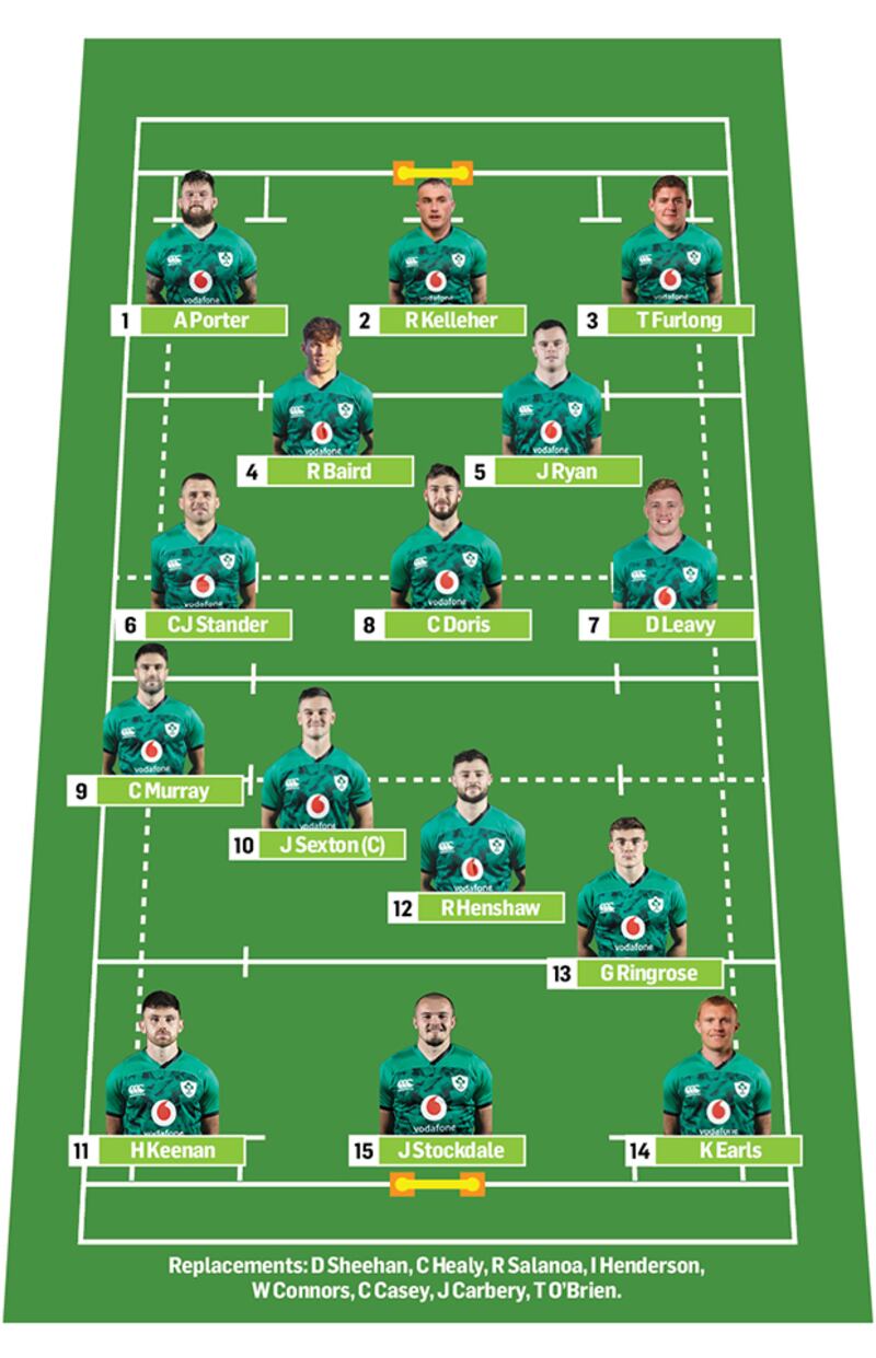 Gavin Cummiskey's Ireland team for 2021 Six Nations: Jacob Stockdale; Keith Earls, Garry Ringrose, Robbie Henshaw, Hugo Keenan; Johnny Sexton (Capt), Conor Murray; Andrew Porter, Ronán Kelleher, Tadhg Furlong; Ryan Baird, James Ryan; CJ Stander, Dan Leavy, Caelan Doris. Replacements: Dan Sheehan, Cian Healy, Roman Salanoa, Iain Henderson, Will Connors, Craig Casey, Joey Carbery, Tommy O'Brien.
