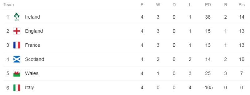 France are currently on 13 points in third place and need to match England’s result on Saturday, while also overturning a current points deficit of two. For example, if England were to beat Italy 40-0, France would need to beat Ireland by 42 points or more.