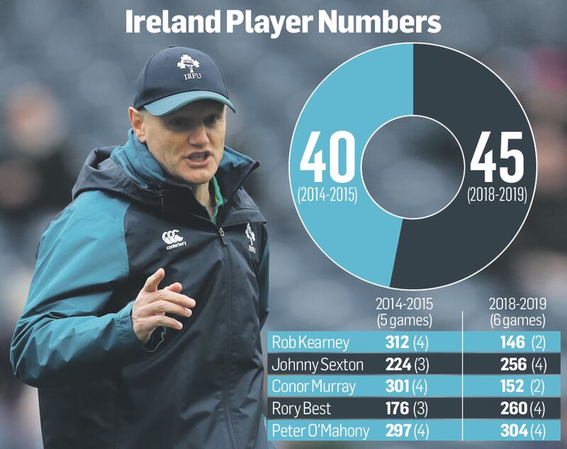In this season's six games against Italy (Chicago), Argentina, New Zealand, USA, England and Scotland the playing roster numbers 45, broadly the same taking the extra game into consideration. Connacht's Bundee Aki and Ulster wing Jacob Stockdale are the only players to have started five of the matches while acknowledging that the injury profile has been significant.