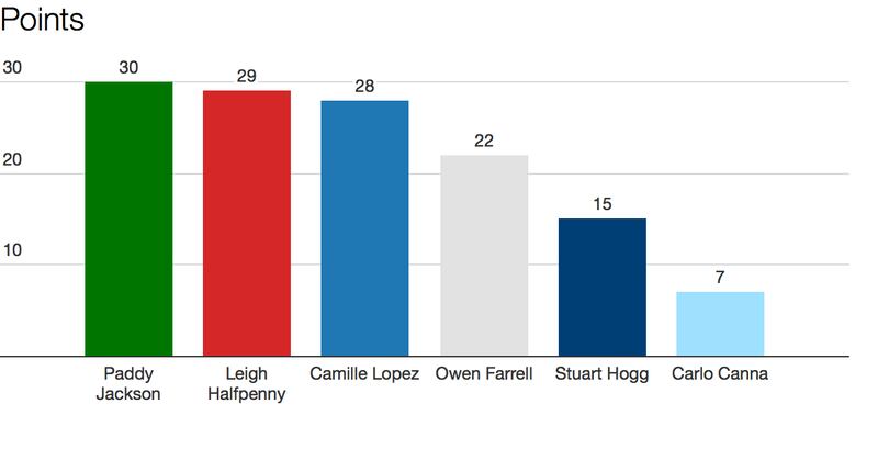 Leigh Halfpenny has kicked 29 points and Camille Lopez 28 - while Stuart Hogg’s three tries make him the leading Scot.