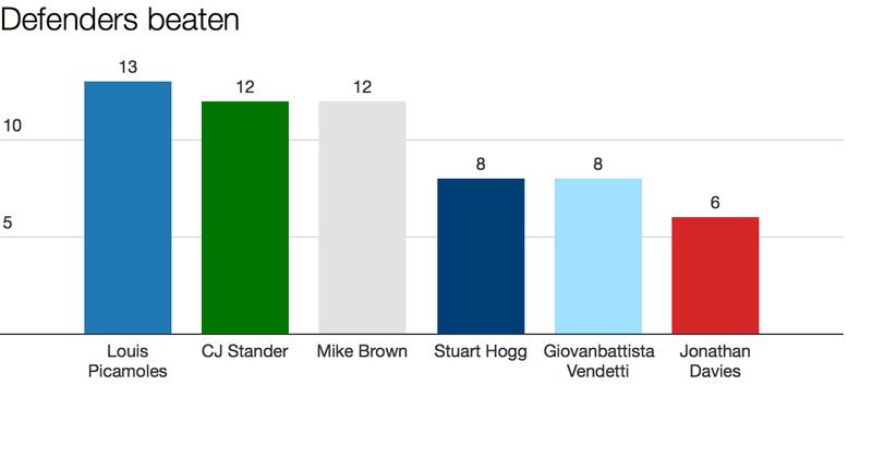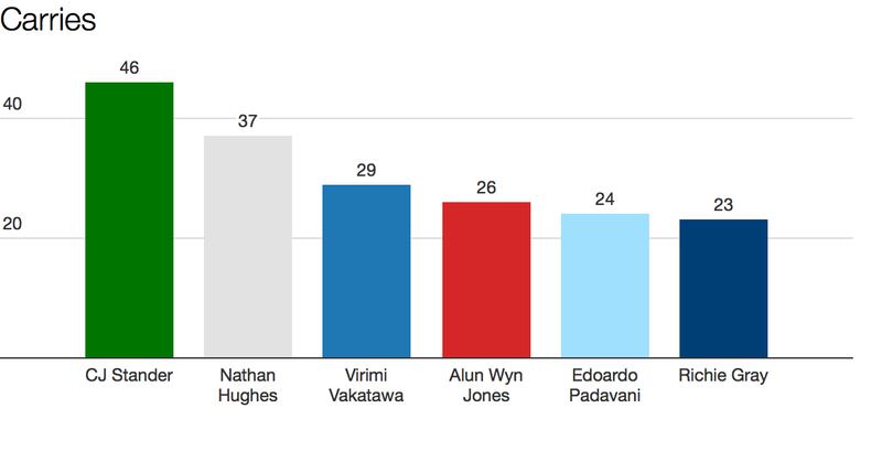 For Ireland CJ Stander has been particularly effective, beating 12 defenders, and has a hat-trick against Italy to show for his efforts - the first by a forward in a Six Nations history. England’s Mike Brown is level with him, while Jonathan Davies again comes out on top for Wales but with a measly six - perhaps suggesting ‘Warren-Ball’ hasn’t departed along with Gatland.