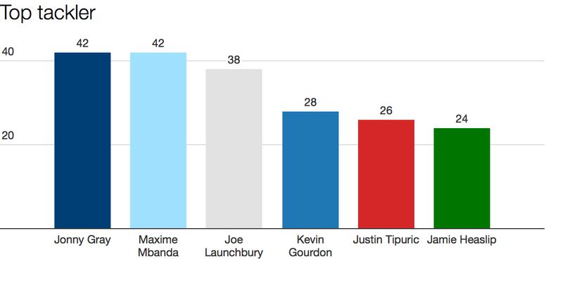 The majority of Joe Launchbury’s 38 tackles came in a man of the match performance against Wales, while Justin Tipuric’s 26 don’t tell the full story of his tireless contributions. Jamie Heaslip is Ireland’s top tackler with 24.